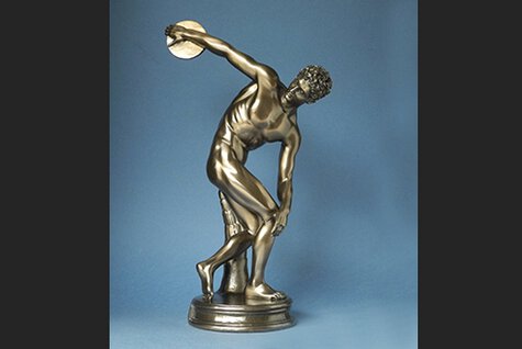 The Discobolus of Myron is an Ancient Greek sculpture completed at the start of the Classical period at around 460–450 BC. The sculpture depicts a youthful male athlete throwing a discus. The bronze Greek original is lost. The work is known through its numerous Roman copies, both full-scale ones in marble, which is cheaper than bronze, such as the first to be recovered, the Palombara Discobolus, and smaller scaled versions in bronze. (WU71978 – h. 27 cm.)