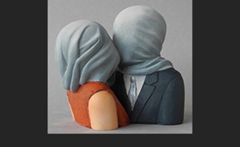 The Lovers (1928). Although their faces are covered by a veil, the lovers kiss passionately. The strangeness this creates is typical of Magritte’s work. (PA21MAG miniature – 10cm. / MAG05 – 12,5cm.)