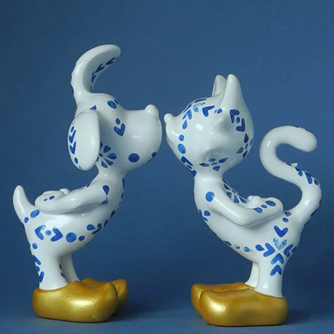 Artist Jacky Zegers shows in her work how beautiful life can be: full of joy, love and wonder. Her art radiates positivity and invites you to pause for a moment and enjoy the moment – always with a playful wink. (JZ62 bronze-coloured set and JZ63 Delft blue set – h. 10.5 cm.)