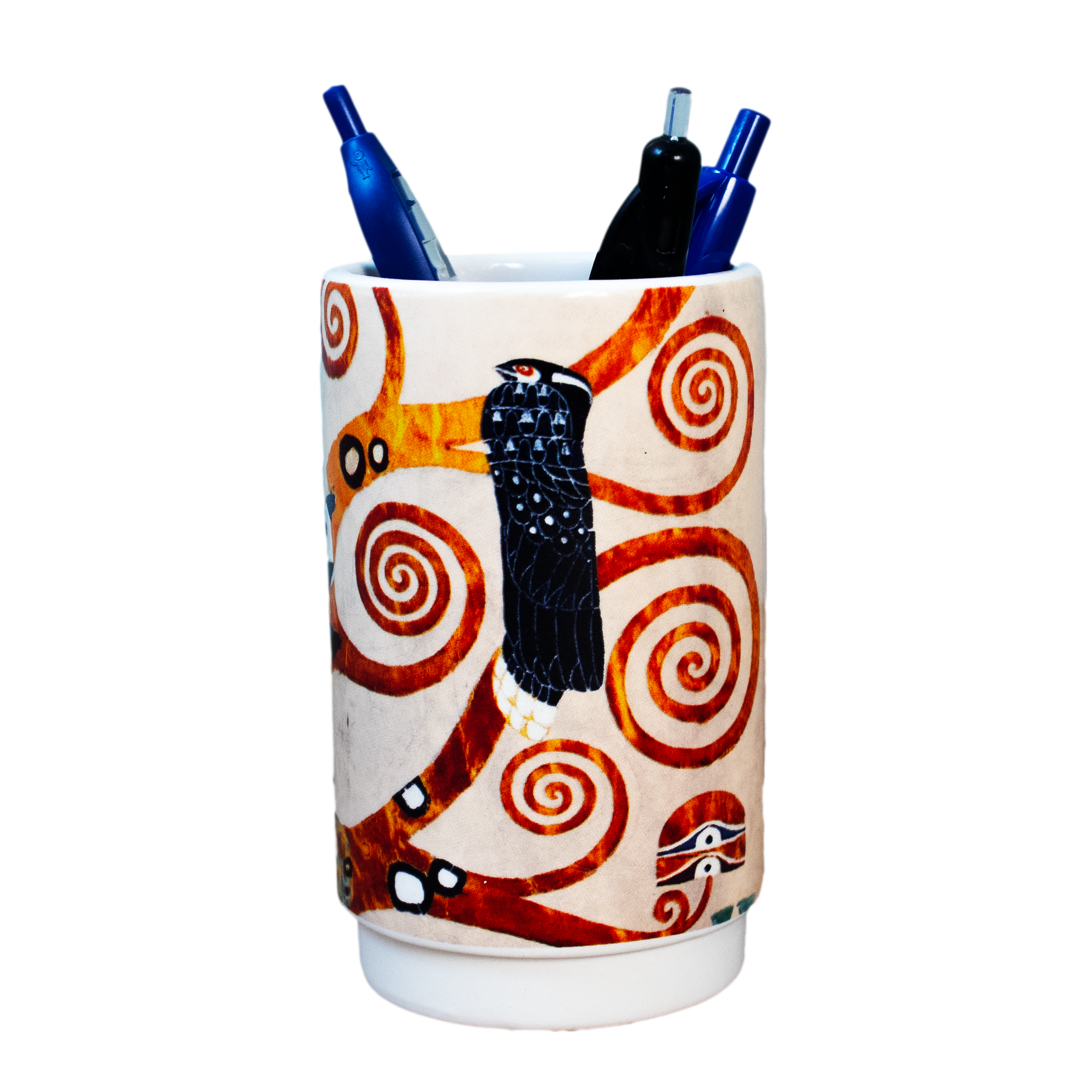 Add a touch of Art Nouveau elegance to your desk with our pen holder featuring The Tree of Life, Stoclet Frieze (1905) by Gustav Klimt. The symbolic Tree of Life is part of the decorative design for a mosaic on the frieze of the dining room at the Palais Stoclet in Brussels. This masterpiece, with its graceful lines, golden accents, and lush details, transforms your workspace into an inspiring environment. Functional and stylish, this pen holder provides the perfect home for all your pens, pencils, and markers, while allowing you to enjoy an iconic work of art every day.