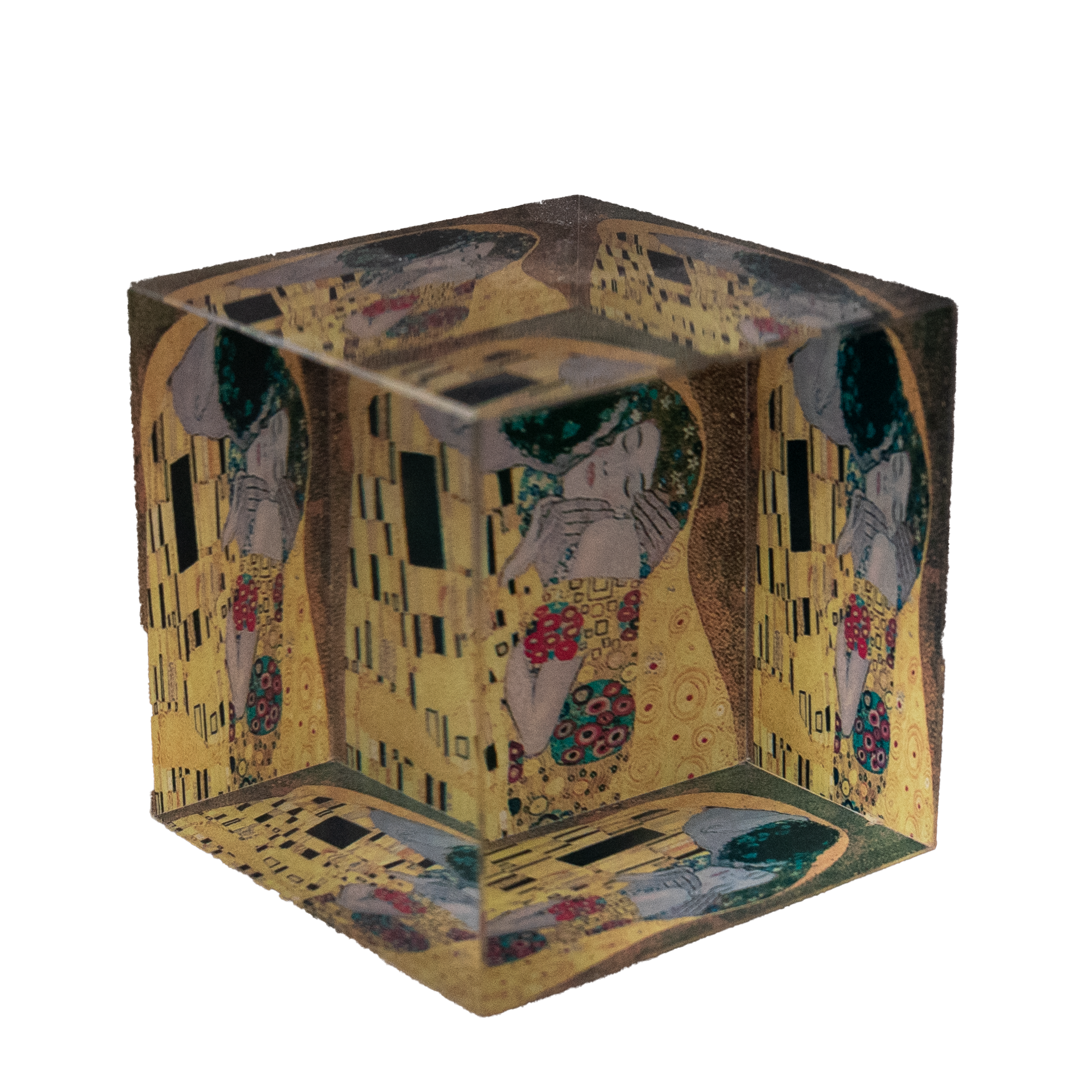 Bring a piece of lush, symbolist art into your home with this beautiful The Kiss paperweight from our QB-Art collection. The iconic masterpiece by Gustav Klimt comes to life in a captivating kaleidoscopic effect that plays with color, light, and depth.