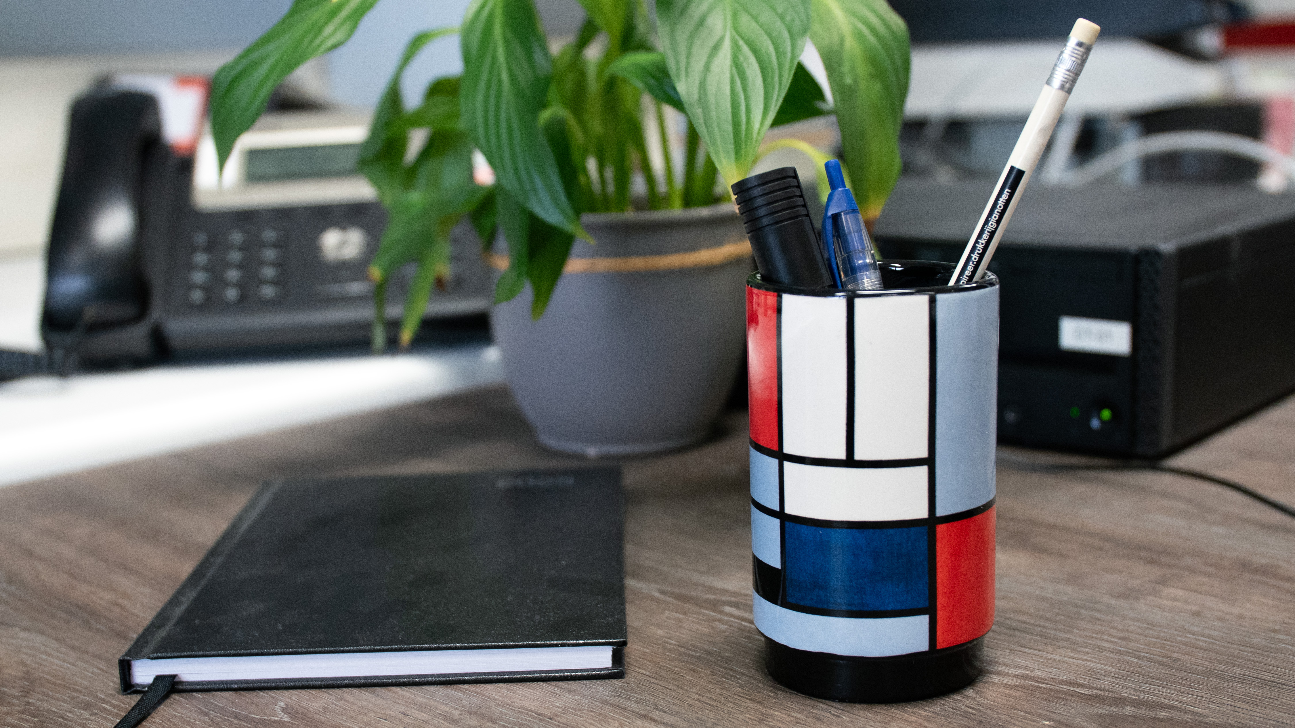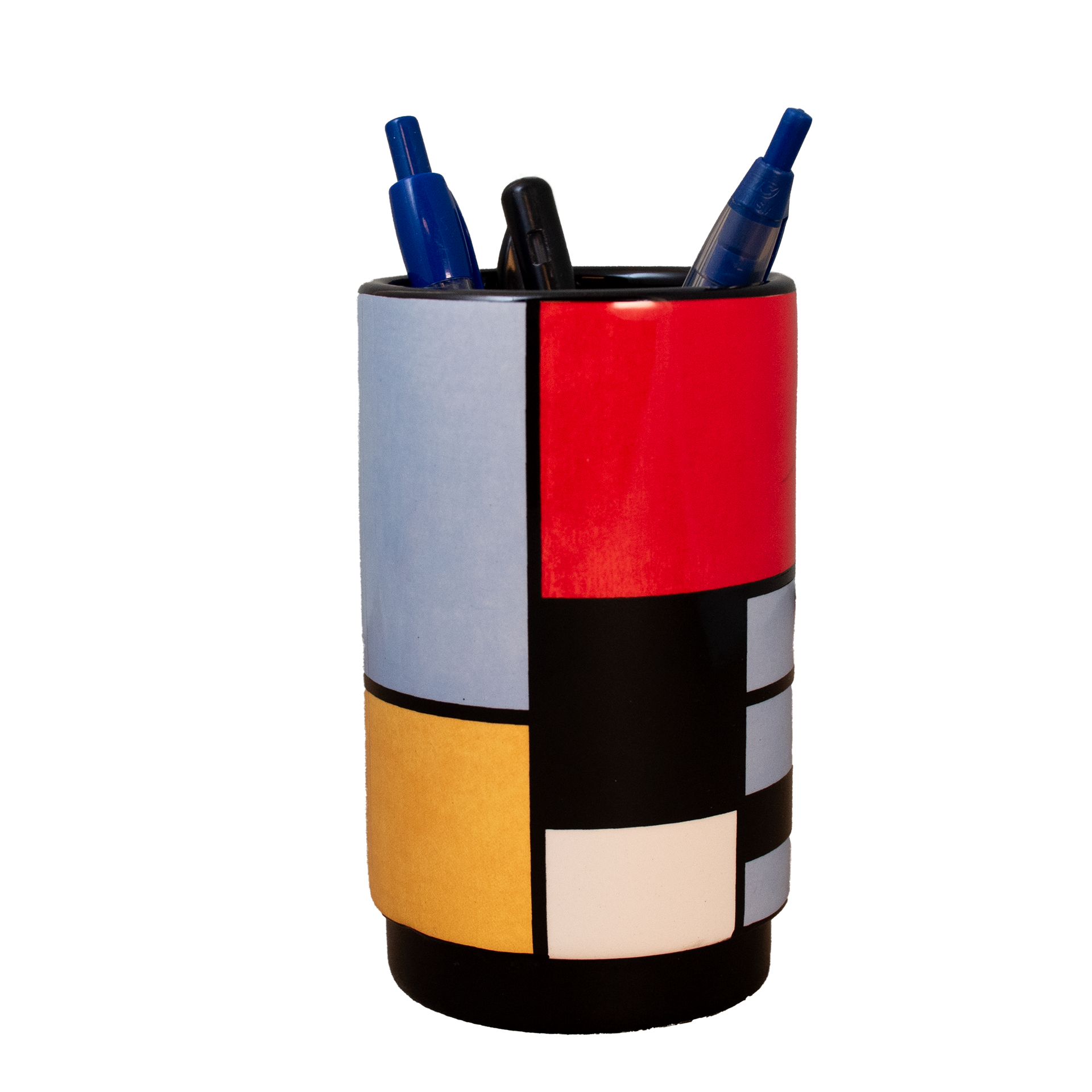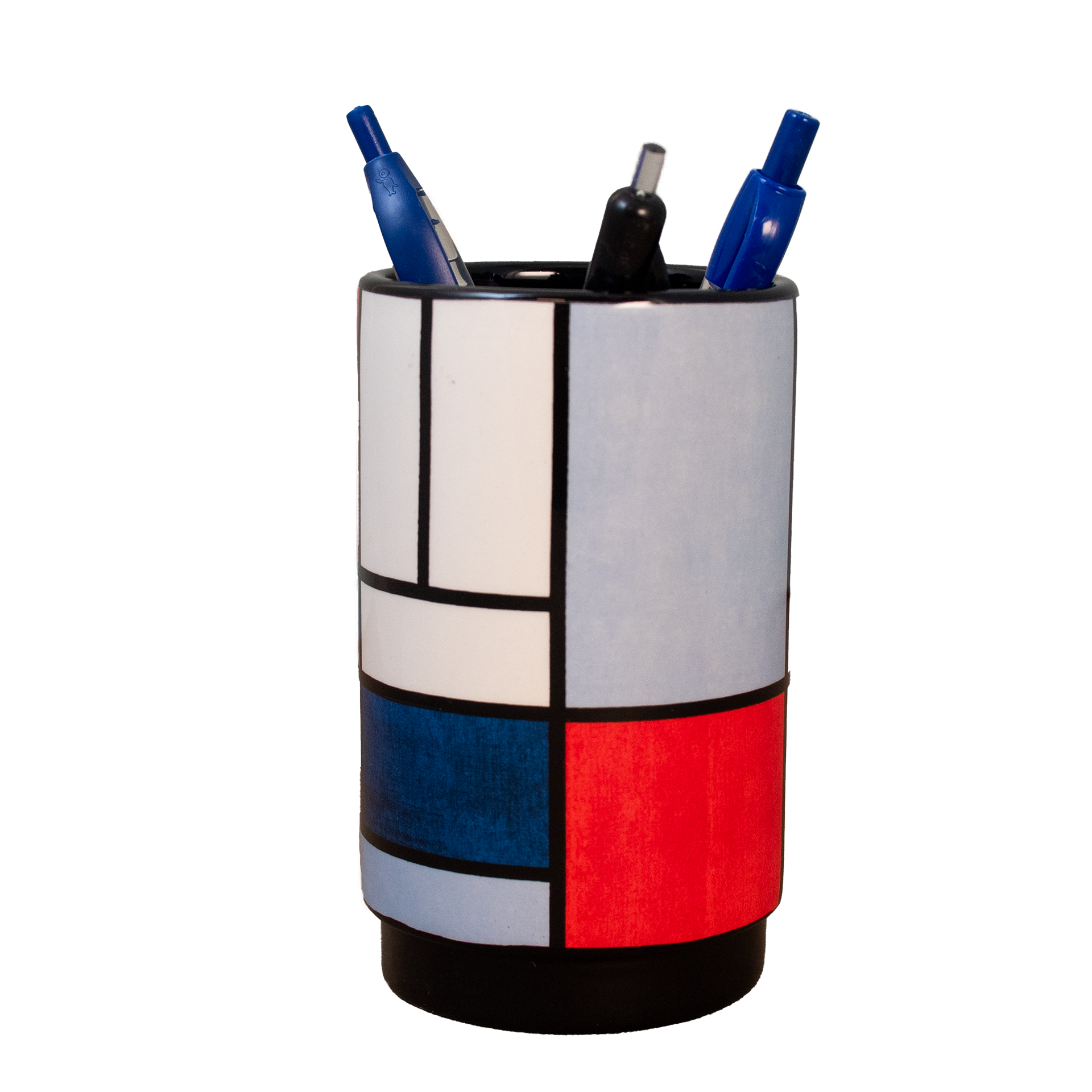 Bring abstraction to your desk with our pen holder featuring Composition with Large Red Plane, Yellow, Black, Grey, and Blue (1921) by Piet Mondriaan. This composition is one of the most important works of what Mondrian called neoplasticism. In 1920, he published Le Néo-plasticisme, in which he theoretically developed his ideas, building on earlier publications in De Stijl about his ‘new imagery.’ The work still shows relatively many colored planes, before Mondrian in later years continued his search for the right rhythm and perfect balance. Functional and stylish, this pen holder provides the ideal home for all your pens, pencils, and markers, while allowing you to enjoy a masterpiece of modern art every day.