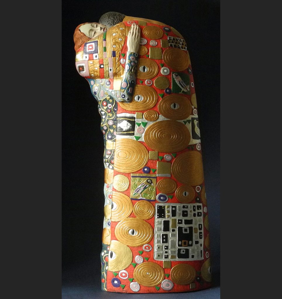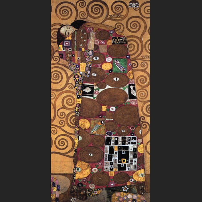 The lovers turn their backs against the world hiding behind the salutary Jugendstil ornamentation in a rigid embrace. These figures form a part of a decorative mosaic design in the dining room frieze of the 'Palais Stocklet' in Brussels.
