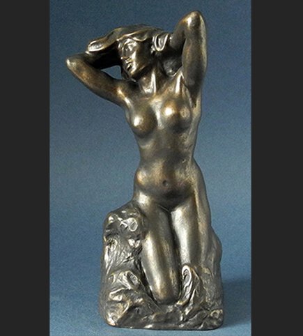 This sensual Venus figure is based on the kneeling feminine faun in the Tympan from The Gates of Hell, a bronze portal meant for the Nusee des Arts Décoratifs, which was never finished. The faun is part of the complex composition of charming nudes to both sides of the famous The Thinker, at the top of The Gates of Hell. With firm and authentic spheres, Rodin created a playful distinction between shadow and light, rendering a strong, yet vulnerable, woman – intangible for mankind, but not for the artist Rodin.