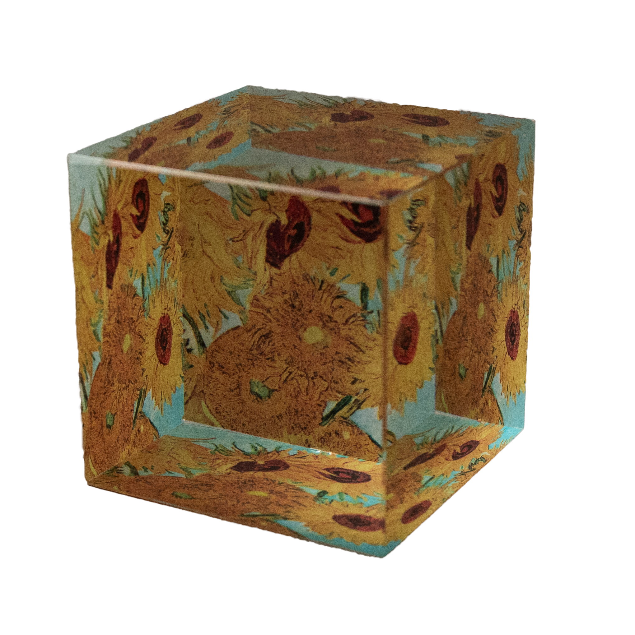 Bring a touch of sunshine into your home with this beautiful Sunflowers paperweight from our QB-Art collection. The iconic masterpiece by Vincent van Gogh comes to life in a captivating kaleidoscopic effect that plays with color, light, and depth.