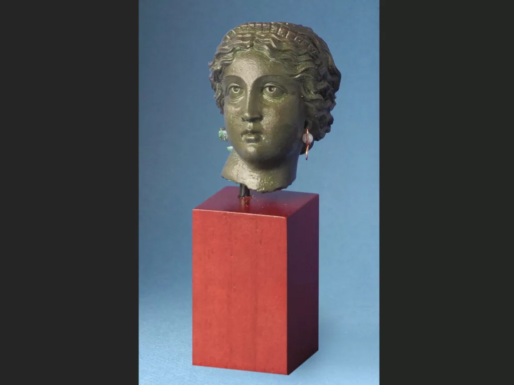 The distinctive hairstyle and diadem identify this small head as an image of Venus. Like her Greek counterpart Aphroidite, Venus was intimately associated with love and beauty, yet other elements were connected to the Roman goddess.